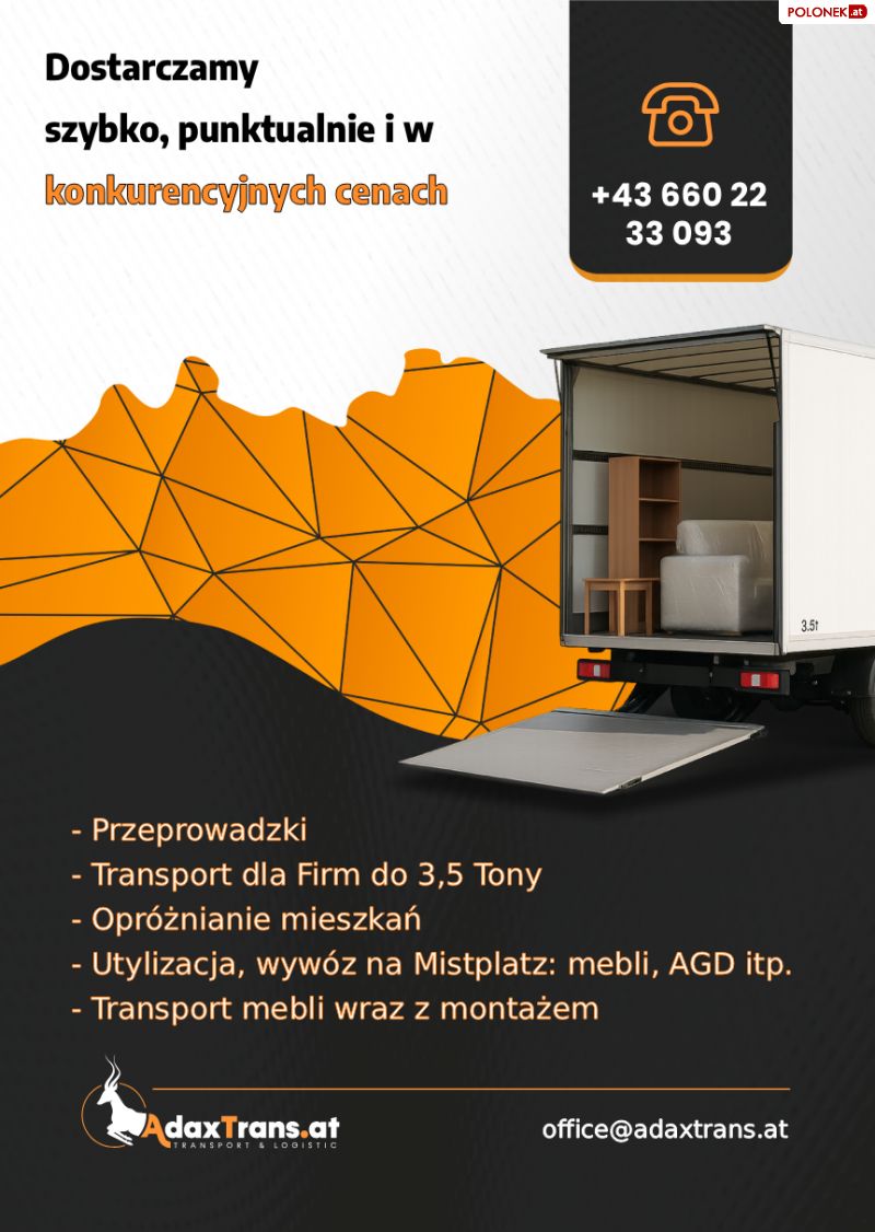 Transport na terenie Wiednia i całej Austrii: ✔️Przeprowadzki (bezpłatna wycena na terenie Wiednia) ✔️Transport mebli ze Sklepów jak również zakupionych na Willhaben (z montażem/demontażem) ✔️Transport materiałów budowlanych ✔️Transport dla Firm ✔️Utylizacja zbędnych rzeczy na Mistplaz (mebli, Sprzętu RTV/AGD, opróżnianie mieszkań i piwnic) Zadzwoń lub napisz i sprawdź naszą ofertę ☎️ 0043 6602233093, office@adaxtrans.at